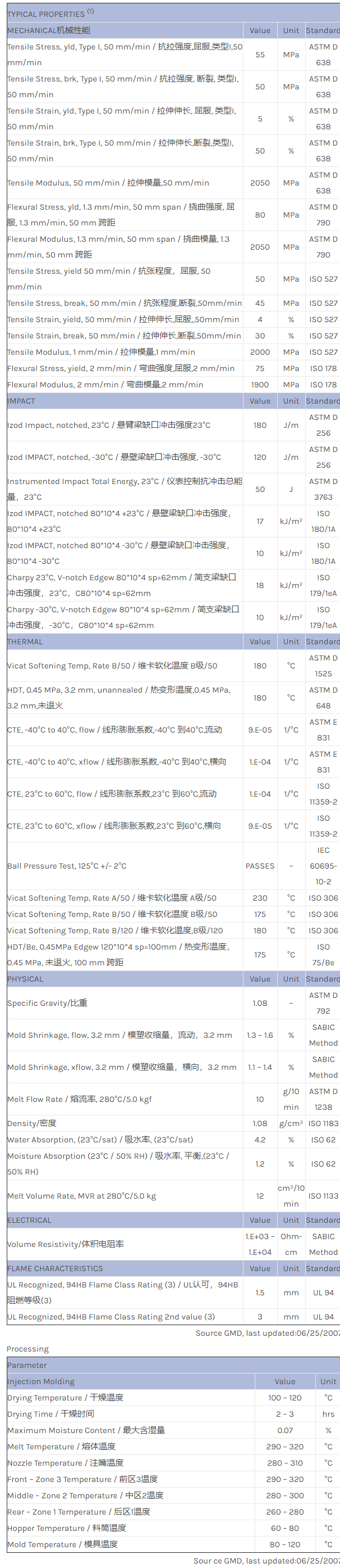 应用范围:产品描述NORYL GTX GTX974物性表NORYL GTX974 is a material especially designed for in- or on-line painted bodypanels and fenders in particular. This material combines impact performance with conductivity for e