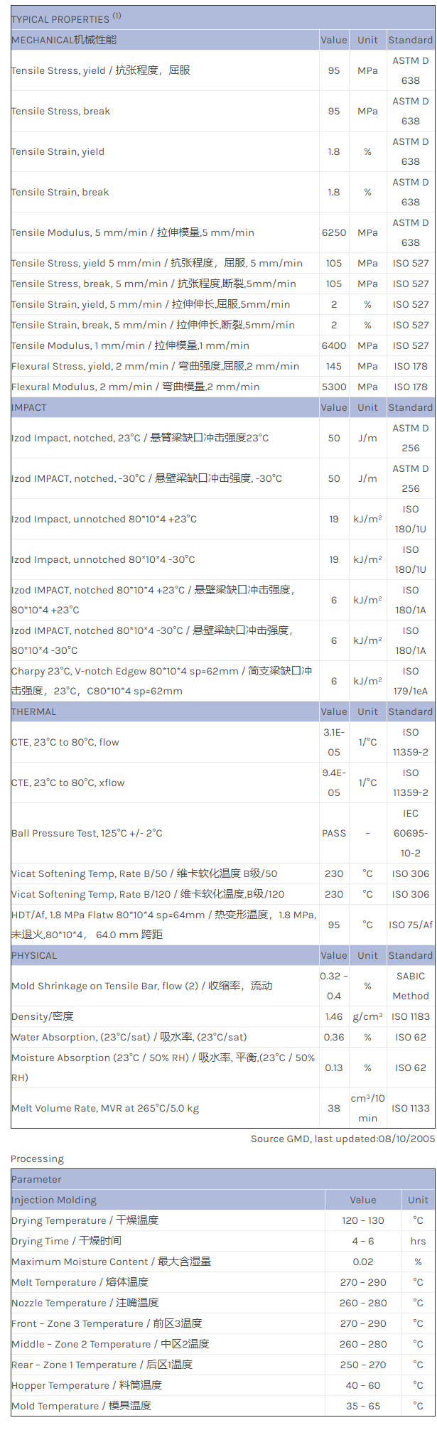 应用范围:产品描述Valox PBT V9235物性表Valox heat stabilized, Glass filled grade with mold release based on recycle PET. This grade is typically applied for business Machines applications