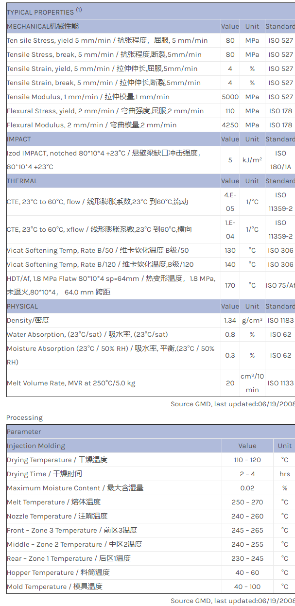 15% Glass reinforced nucleated PBT/ASA improved release, with excellent MECHANICAL机械性能 properties high dimensional stability, and low Density/密度.