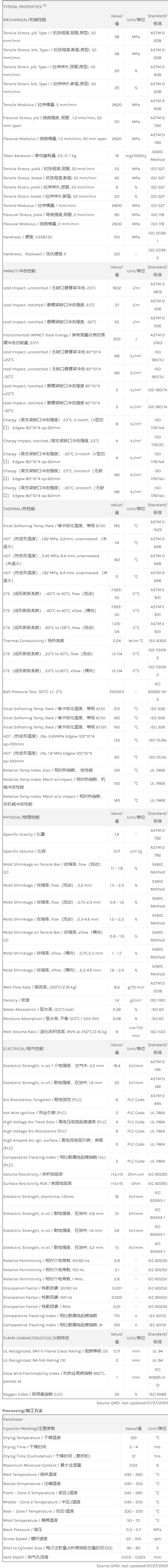 应用范围: 产品描述 Valox PBT 310SE0物性表 未增强型。 UL94V-0/5VA 额定值。电力工业、线轴、键盘开关及开关组件、工具外壳。 相关颜色色号:310SE0-GY4E254、310SE0-BK1066、310SE0-1001、310SE0-BL3D029、310SE0- WH4581、310SE0-BL3E215、310SE0-WH9D692、310SE0-7001、310S