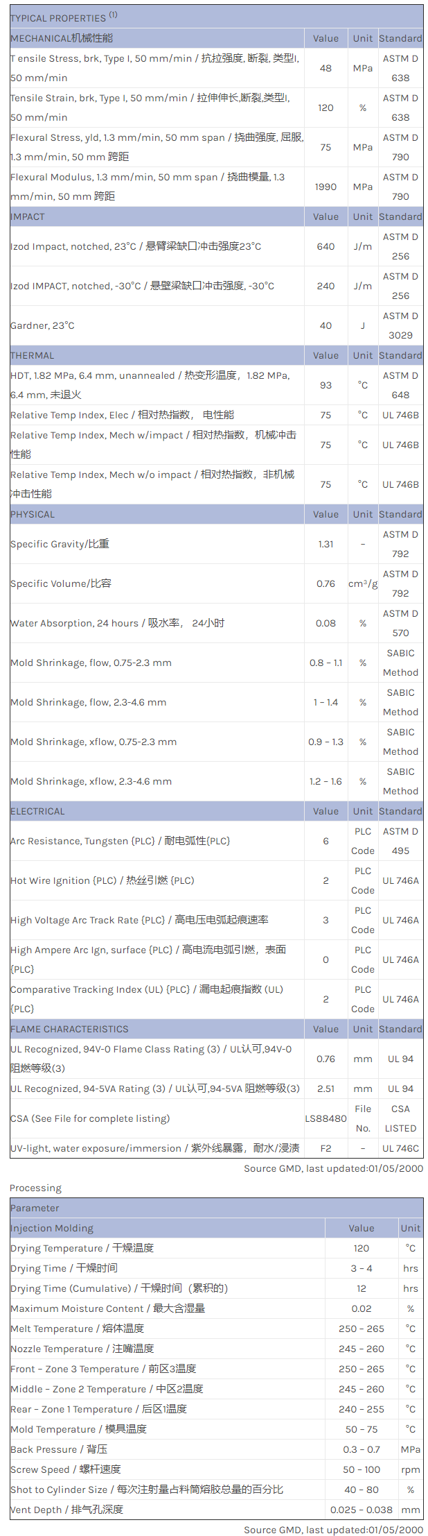 EXISTING APPLICATIONS ONLY: Unreinforced, impact modified, flame retarded; retains impact at low temperature. Replacement under development.
