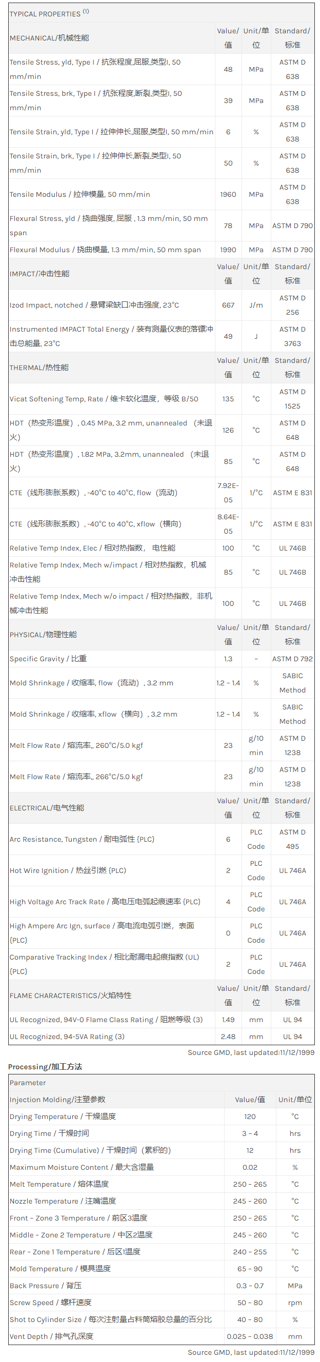 应用范围: 产品描述 Valox PBT 3706物性表 “Valox 3706 resin是一种聚碳酸酯+聚丁烯对苯二甲酸酯(PC+PBT)产品,它可以通过注射成型进行加工。 典型应用领域为:户外应用。 特性包括: 阻燃/额定火焰 冲击改性” 相关颜色色号:3706-GY8C022、3706-GY5D521、3706-BK1066、3706-OR4B079、3706-GY4D524、 37