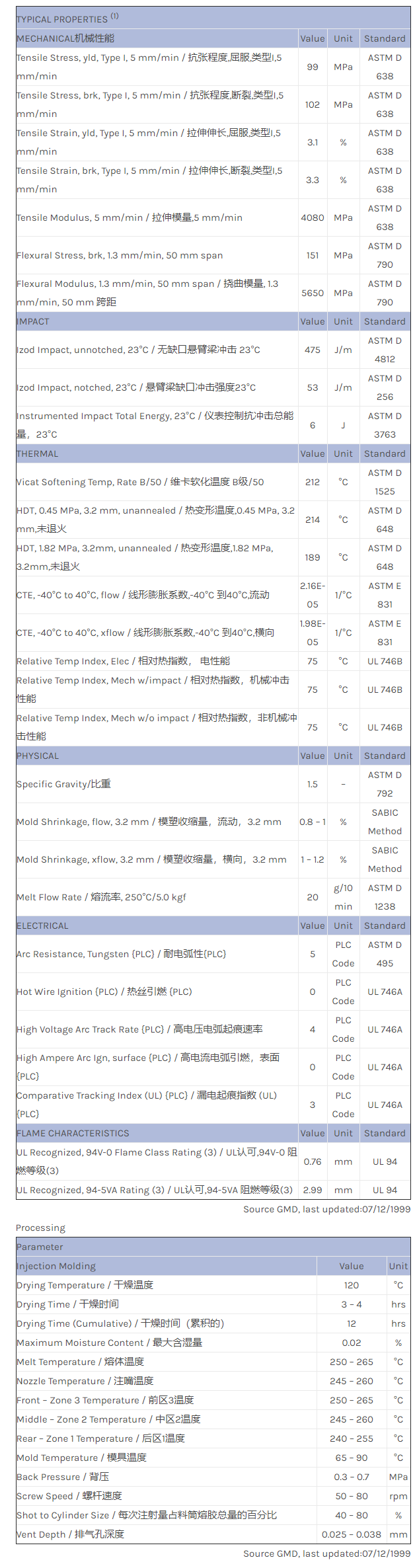 应用范围:产品描述Valox PBT K4630物性表17% glass reinforced, flame retardant PBT+PC. FR ratings approved with 50% regrind approved by UL.